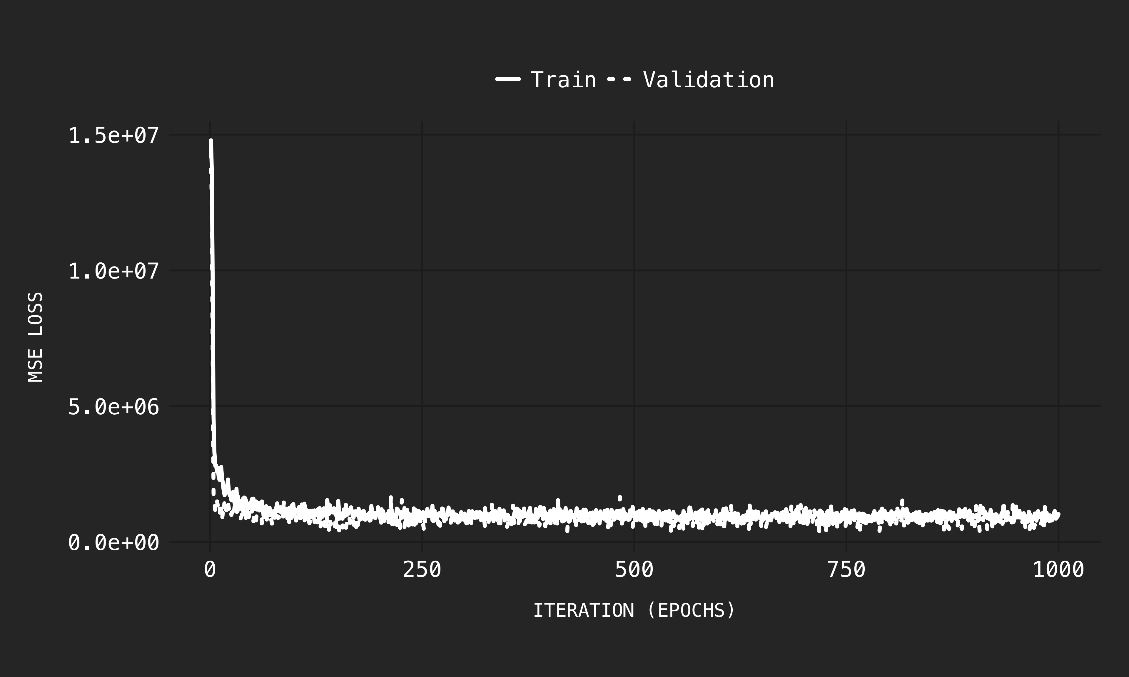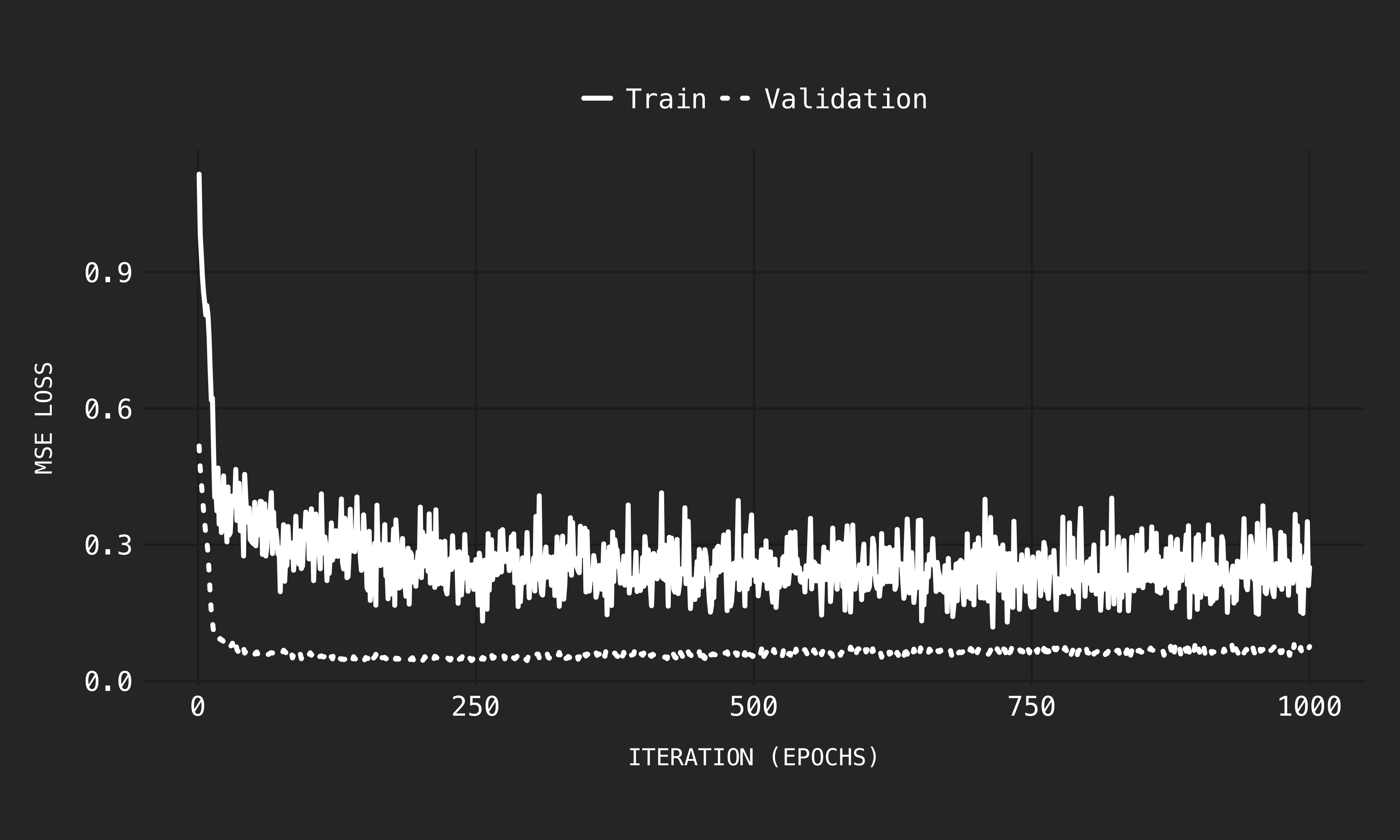 suppressPackageStartupMessages({library(torch)library(tibble)library(tidyr)library(ggplot2)})# ---- Ensure torch runtime -----------------------------------------------------if (!torch_is_installed()) install_torch()set.seed(42); torch_manual_seed(42)# ---- Get REAL data ------------------------------------------------------------get_splits <-function() {if (all(c("X_train","y_train","X_valid","y_valid") %in%ls(envir = .GlobalEnv))) {list(X_train =as.matrix(get("X_train", envir = .GlobalEnv)),y_train =as.numeric(get("y_train", envir = .GlobalEnv)),X_valid =as.matrix(get("X_valid", envir = .GlobalEnv)),y_valid =as.numeric(get("y_valid", envir = .GlobalEnv)) ) } elseif (exists("monthly_df", inherits =TRUE)) { make_lags <-function(x, n_lags) { E <-embed(x, n_lags +1)list(X = E[, -1, drop =FALSE], y = E[, 1]) } N_LAGS <-get0("N_LAGS", ifnotfound =12L) VALID_FR <-get0("VALID_FR", ifnotfound =0.20) series <- monthly_df$price lagged <-make_lags(series, N_LAGS) X_all <- lagged$X; y_all <- lagged$y n <-nrow(X_all) v_n <-max(1, round(n * VALID_FR)) v_i0 <- n - v_n +1list(X_train = X_all[1:(v_i0 -1), , drop =FALSE],y_train = y_all[1:(v_i0 -1)],X_valid = X_all[v_i0:n, , drop =FALSE],y_valid = y_all[v_i0:n] ) } else {stop("No real data found. Provide X_train/y_train/X_valid/y_valid or monthly_df.") }}splits <-get_splits()X_train <- splits$X_train; y_train <- splits$y_trainX_valid <- splits$X_valid; y_valid <- splits$y_valid# Align just in casen <-min(nrow(X_valid), length(y_valid))X_valid <- X_valid[seq_len(n), , drop =FALSE]y_valid <- y_valid[seq_len(n)]# ---- Scale by training stats --------------------------------------------------x_mu <-colMeans(X_train)x_sd <-apply(X_train, 2, sd); x_sd[!is.finite(x_sd) | x_sd ==0] <-1X_train_s <-sweep(sweep(X_train, 2, x_mu, "-"), 2, x_sd, "/")X_valid_s <-sweep(sweep(X_valid, 2, x_mu, "-"), 2, x_sd, "/")y_mu <-mean(y_train); y_sd <-sd(y_train); if (!is.finite(y_sd) || y_sd ==0) y_sd <-1y_train_s <- (y_train - y_mu) / y_sdy_valid_s <- (y_valid - y_mu) / y_sdx_tr <-torch_tensor(X_train_s, dtype =torch_float())y_tr <-torch_tensor(matrix(y_train_s, ncol =1), dtype =torch_float())x_va <-torch_tensor(X_valid_s, dtype =torch_float())y_va <-torch_tensor(matrix(y_valid_s, ncol =1), dtype =torch_float())# ---- MLP: 3->8->4->1 with ReLU + Dropout(0.2) --------------------------------mlp <-nn_module(initialize =function(input_dim) { self$fc1 <-nn_linear(input_dim, 8) self$drop1 <-nn_dropout(p =0.2) self$fc2 <-nn_linear(8, 4) self$drop2 <-nn_dropout(p =0.2) self$fc3 <-nn_linear(4, 1) },forward =function(x) { x %>% self$fc1() %>%nnf_relu() %>% self$drop1() %>% self$fc2() %>%nnf_relu() %>% self$drop2() %>% self$fc3() })net <-mlp(ncol(X_train_s))optim <-optim_adam(net$parameters, lr =1e-3)epochs <-1000Lbatch_size <-5Ln_tr <-nrow(X_train_s)loss_tr <-numeric(epochs)loss_va <-numeric(epochs)for (e in1:epochs) { ord <-sample.int(n_tr) nb <-0; acc <-0for (i inseq(1, n_tr, by = batch_size)) { idx <- ord[i:min(i + batch_size -1L, n_tr)] xb <- x_tr[idx, , drop =FALSE] yb <- y_tr[idx, , drop =FALSE] net$train(); optim$zero_grad() out <-net(xb) loss <-nnf_mse_loss(out, yb) loss$backward(); optim$step() acc <- acc +as.numeric(loss$item()); nb <- nb +1L } loss_tr[e] <- acc / nb net$eval()with_no_grad({ pv <-net(x_va) loss_va[e] <-as.numeric(nnf_mse_loss(pv, y_va)$item()) })}# ---- Plot loss curve (no legend title) ---------------------------------------bg_col <-"#313131"fg_col <-get0("fg_col", ifnotfound ="#ffffff")grid_col <-"#252525"font_family <-"Menlo"tibble(iter =seq_len(epochs), Train = loss_tr, Validation = loss_va) |>pivot_longer(-iter, names_to ="Series", values_to ="Loss") |>ggplot(aes(iter, Loss, linetype = Series)) +geom_line(color ="#ffffff", linewidth =1.2, lineend ="round") +scale_linetype_manual(name =NULL, # remove legend titlevalues =c(Train ="solid", Validation ="dotted") ) +guides(linetype =guide_legend(title =NULL)) +labs(x ="ITERATION (EPOCHS)", y ="MSE LOSS") +theme_minimal(base_size =12, base_family = font_family) +theme(plot.margin =margin(t =36, r =18, b =36, l =18),axis.title.x =element_text(margin =margin(t =14), color = fg_col),axis.title.y =element_text(margin =margin(r =14), color = fg_col),axis.text =element_text(size =14, color = fg_col),legend.text =element_text(size =14, color = fg_col),legend.title =element_blank(), # also remove via themelegend.position ="top",legend.key =element_rect(fill = bg_col, color =NA),plot.background =element_rect(fill = bg_col, color =NA),panel.background =element_rect(fill = bg_col, color =NA),panel.grid.major =element_line(color = grid_col),panel.grid.minor =element_blank() )