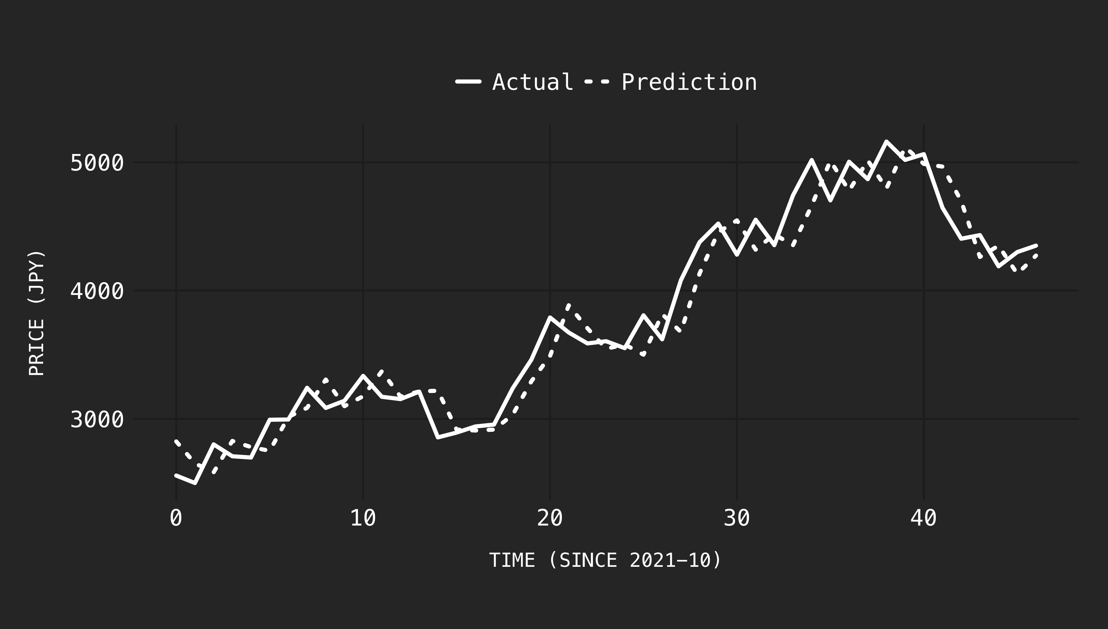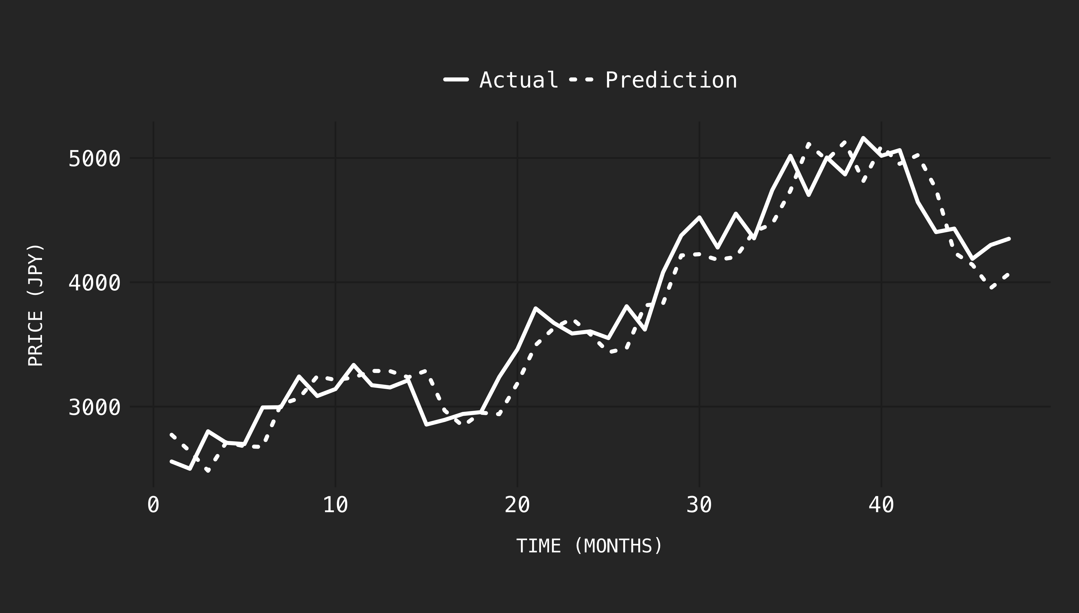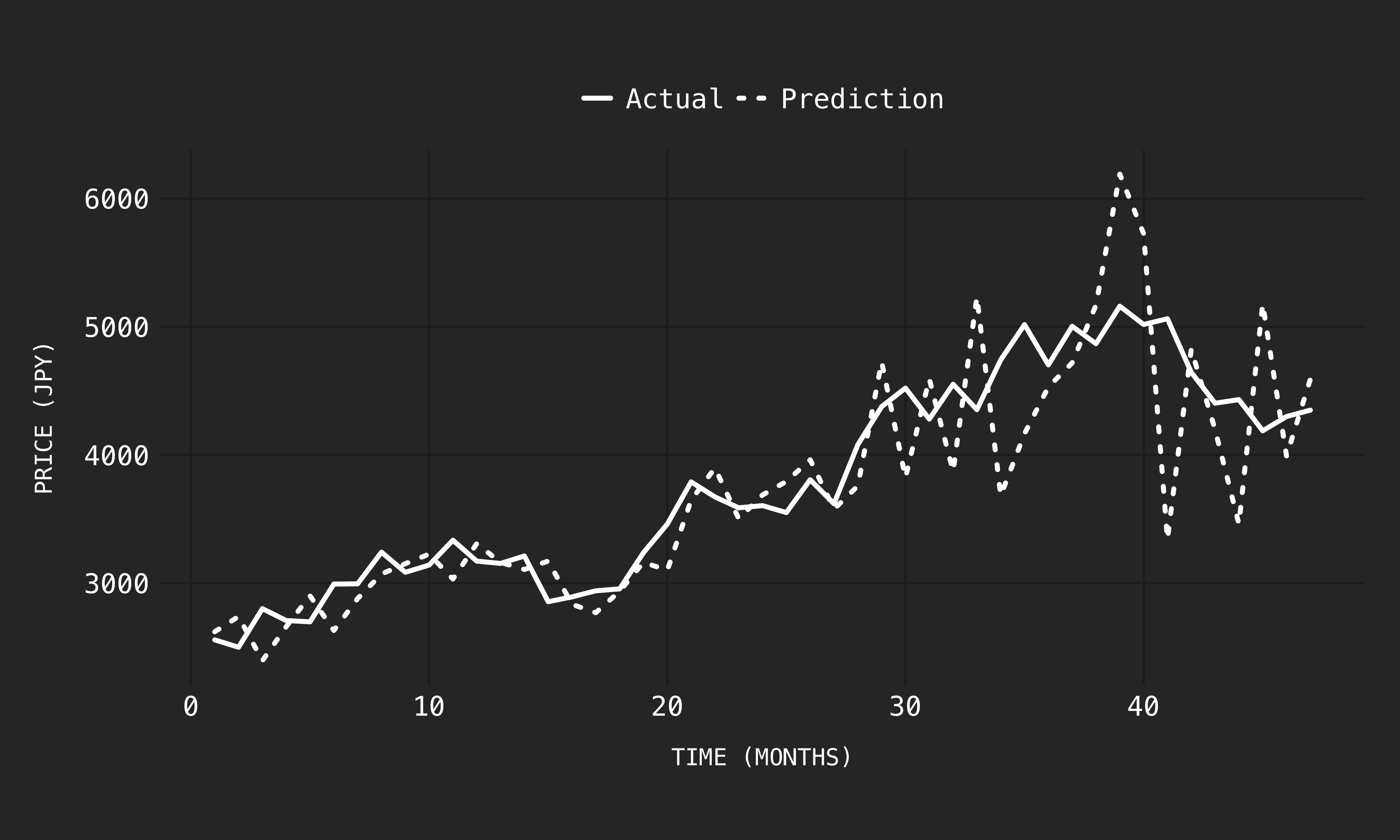 # ---- Dark Menlo styling: white lines, solid/dotted, no legend title ----------bg_col <-"#313131"fg_col <-get0("fg_col", ifnotfound ="#ffffff")grid_col <-"#252525"font_family <-"Menlo"tibble(idx =seq_along(y_valid),Actual = y_valid,Prediction = y_pred) |>pivot_longer(-idx, names_to ="Series", values_to ="Value") |>ggplot(aes(idx, Value, linetype = Series)) +geom_line(color ="#ffffff", linewidth =1.2, lineend ="round") +scale_linetype_manual(name =NULL, # remove legend titlevalues =c(Actual ="solid", Prediction ="dotted") ) +labs(x ="TIME (MONTHS)", y ="PRICE (JPY)") +theme_minimal(base_size =12, base_family = font_family) +theme(plot.margin =margin(t =36, r =18, b =36, l =18),axis.title.x =element_text(margin =margin(t =14), color = fg_col),axis.title.y =element_text(margin =margin(r =14), color = fg_col),axis.text =element_text(size =14, color = fg_col),legend.text =element_text(size =14, color = fg_col),legend.position ="top",legend.key =element_rect(fill = bg_col, color =NA),plot.background =element_rect(fill = bg_col, color =NA),panel.background =element_rect(fill = bg_col, color =NA),panel.grid.major =element_line(color = grid_col),panel.grid.minor =element_blank() )