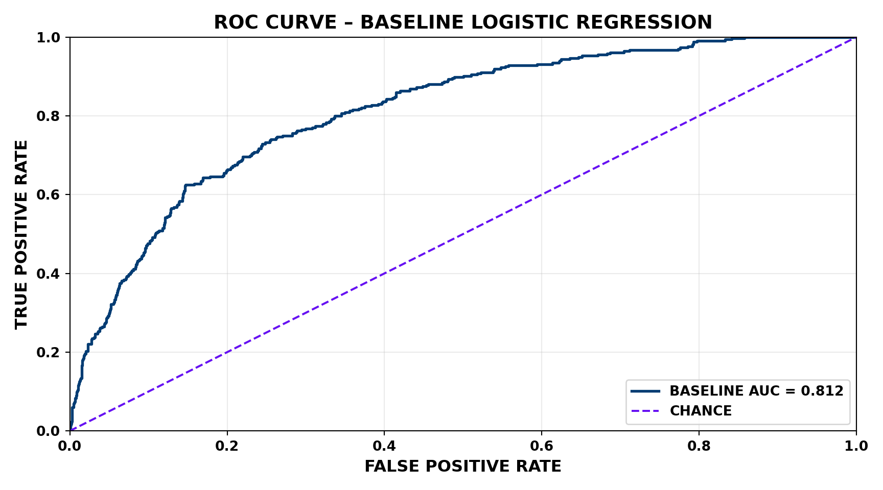 The ROC curve for this baseline model traced out the familiar concave shape above the 45 degree chance line, and the AUC of 0.814 summarized its ability to rank true hits ahead of non hits without committing to a particular cutoff.