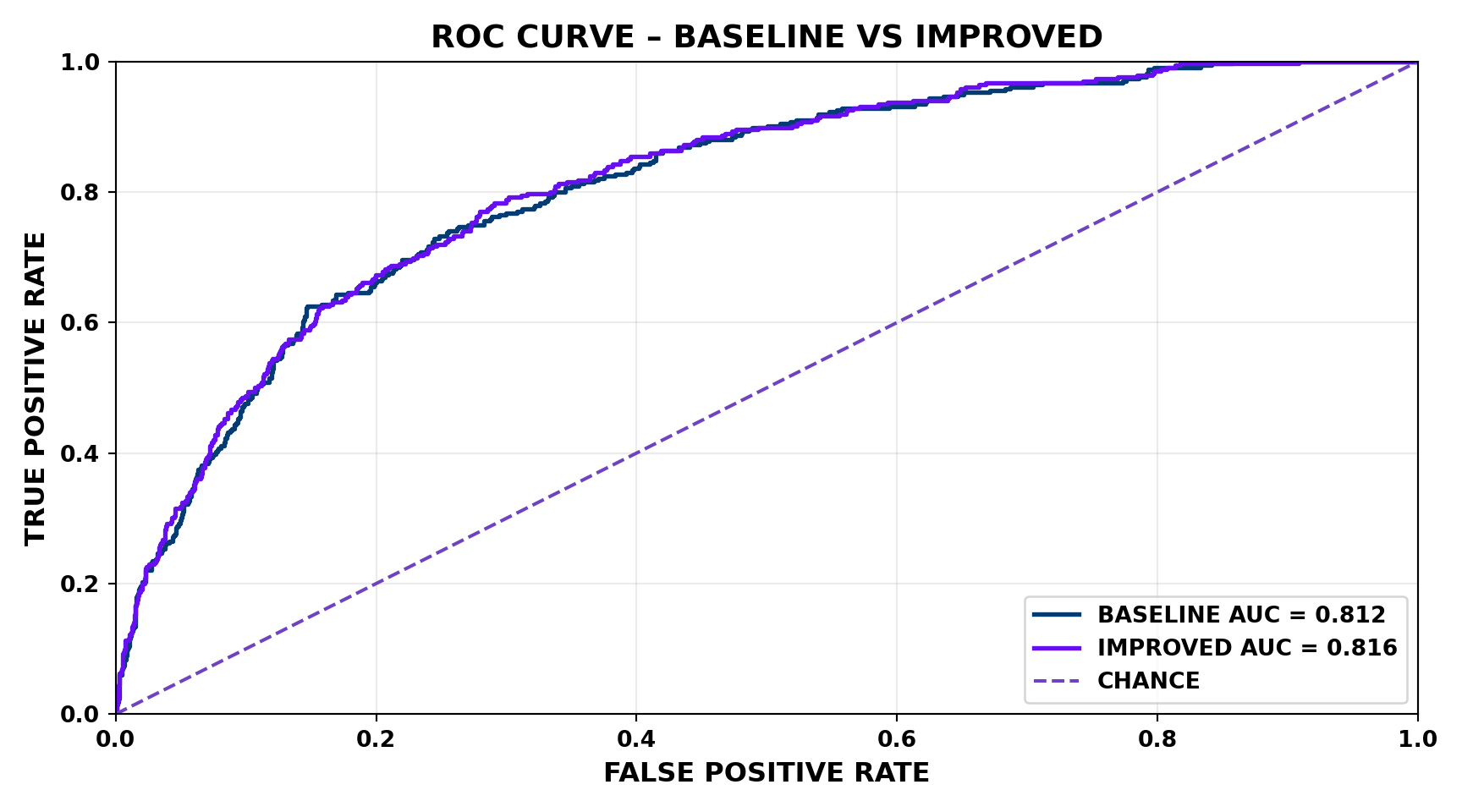 To improve generalization and perform embedded variable selection, the same preprocessing pipeline was plugged into an L1 regularized logistic regression with cross validation. LogisticRegressionCV with an L1 penalty, saga solver, a grid of 10 candidate C values, and five fold cross validation chose the regularization strength by maximizing ROC AUC on the training folds. Using a pipeline meant that both the baseline and improved models saw exactly the same standardized and encoded features, so any difference in performance could be attributed to the penalty rather than to preprocessing choices.